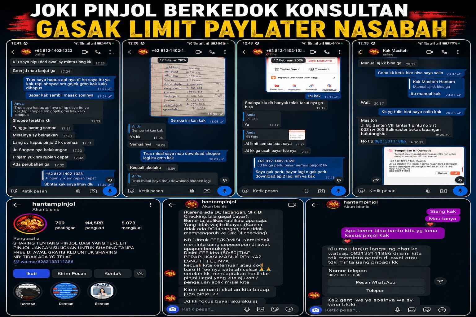Gabungan tangkapan layar profil dan percakapan layanan pinjol yang menawarkan bantuan penyelesaian utang serta mengarahkan komunikasi ke WhatsApp